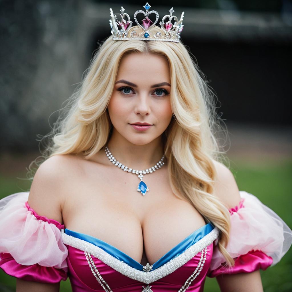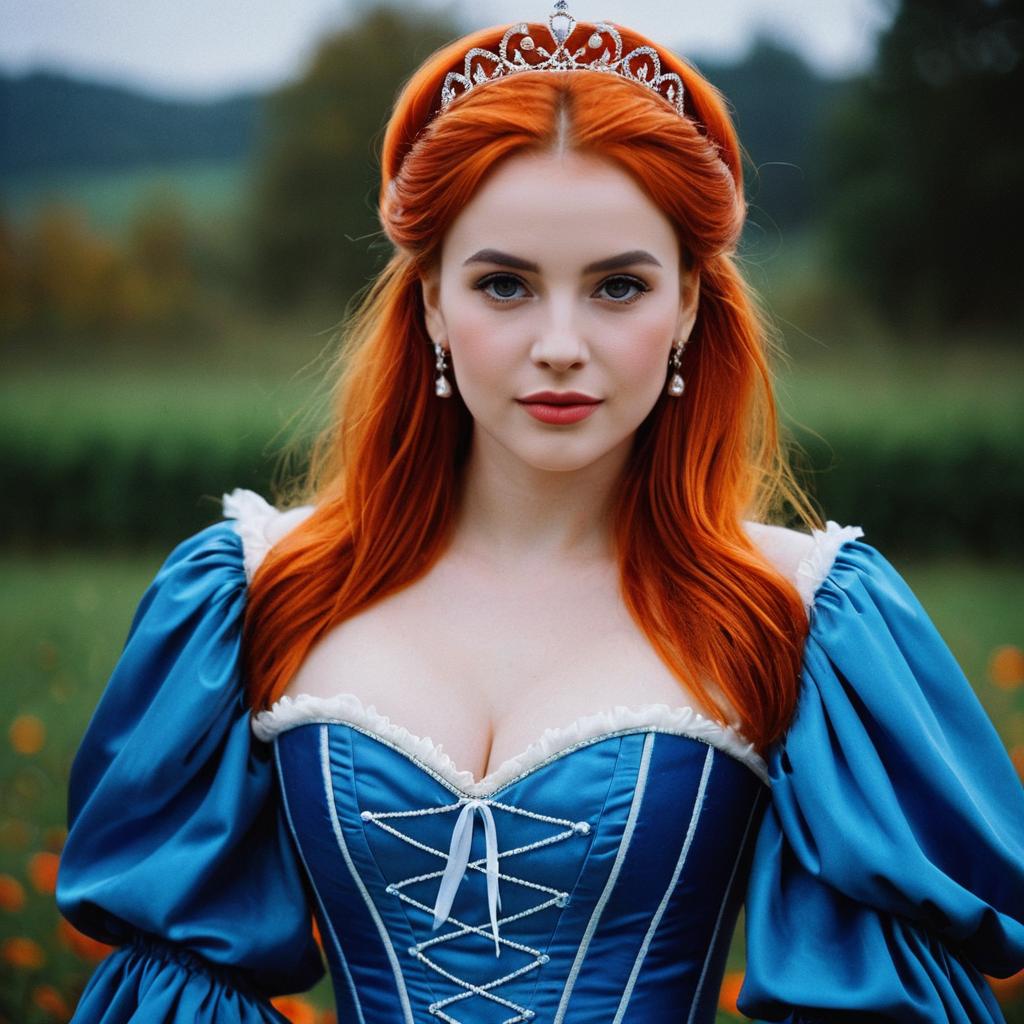 Ariel purple dress costume,1girl, solo, dress, purple dress, red hair, breasts, long hair, puffy sleeves, brown eyes, cleavage, realistic, blurry, blurry background, puffy short sleeves