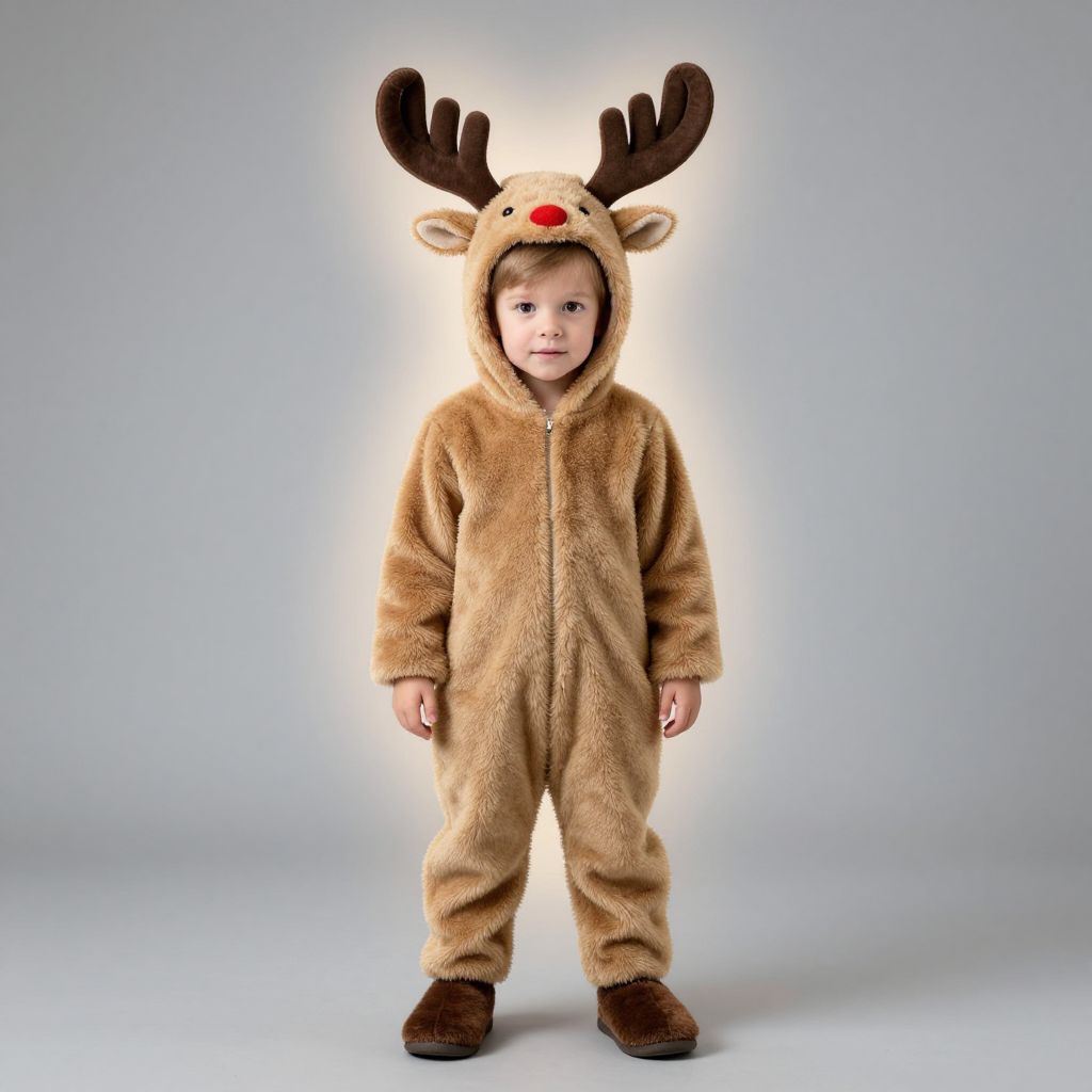 Photograph of a young boy standing against a plain, light gray background. He is wearing a fluffy, tan reindeer onesie with dark brown antlers, a red nose, and black eyes on the hood. The suit is plush and zippered at the front. The boy has short, light brown hair and is looking directly at the camera with a neutral expression. He is also wearing brown, furry shoes. The light source behind him creates a subtle halo effect, highlighting the texture of the onesie. The overall style is playful and festive.