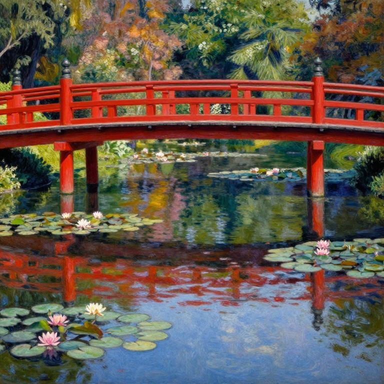 Vibrant reflections dance on the tranquil surface of a lily-filled pond, framed by a striking red Japanese bridge spanning its width, evoking the serene beauty of Claude Monet's \"The Water Lily Pond (The Japanese Bridge)\" from 1899.