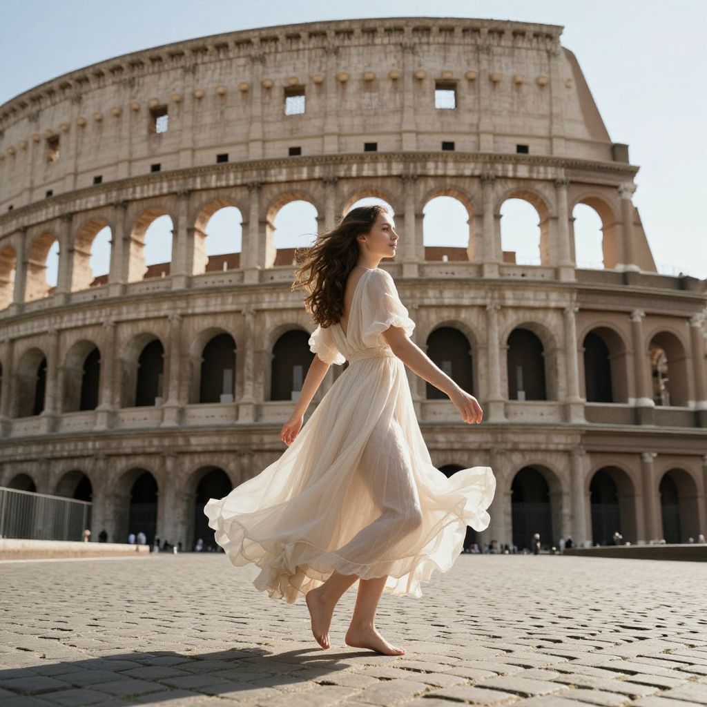 Captured in a moment of ethereal freedom, a woman's flowing dress whispers stories of timelessness as her bare feet dance across cobblestones, weaving a tapestry of joy and serenity amidst the enduring grandeur of Rome’s ancient Colosseum.