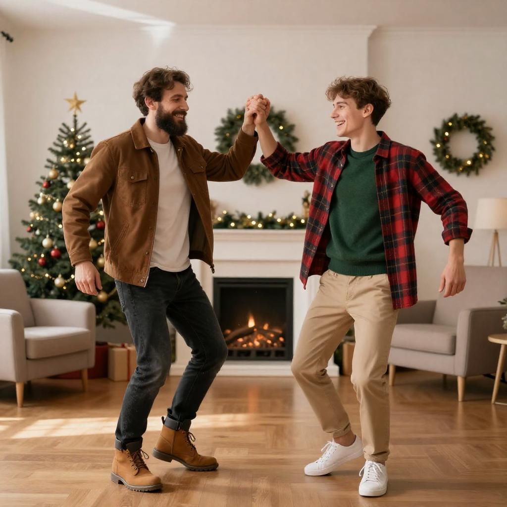 Two men in an industrial warehouse. One kicks the other in the chest. Kicker wears black jacket, jeans, white sneakers. Kicked wears brown jacket, jeans, black shoes. Kicked man bends forward, arms out. Kicker's face shows intense focus.