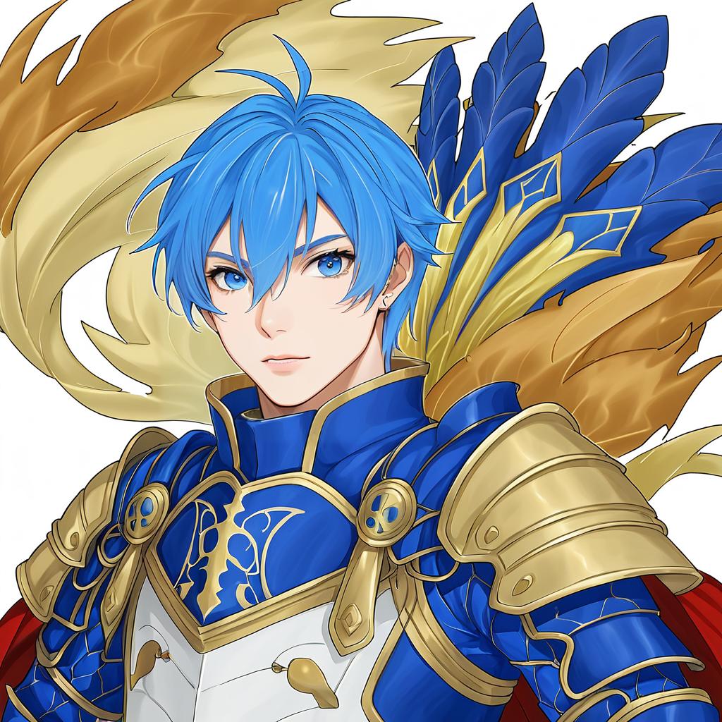 Digital illustration of a male anime character with striking blue and blonde two-tone hair and blue eyes. He is depicted wearing ornate blue and gold scale armor with golden shoulder plates, a high collar, and a red cape. The character features blue feathered decorations on his back and an elegant, confident expression. The style is detailed and vibrant, influenced by fantasy and anime themes.