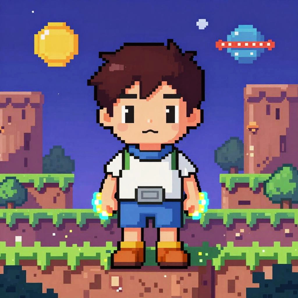 An extreme long shot showcasing a vibrant 8-bit landscape. The central figure is a young alien child with bioluminescent arms, embodying a space explorer novice. This pixelated masterpiece captures the essence of retro video games, influenced by the styles of Makoto Shinkai and Yoshitaka Amano.