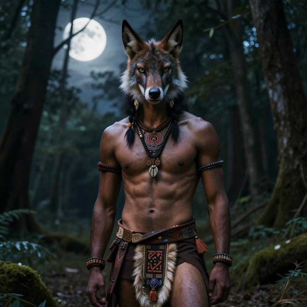 Half man half jackal hybrid with piercing eyes and sleek fur, dressed in tribal garments, standing solemnly in a moonlit forest clearing, ethereal and mysterious atmosphere
