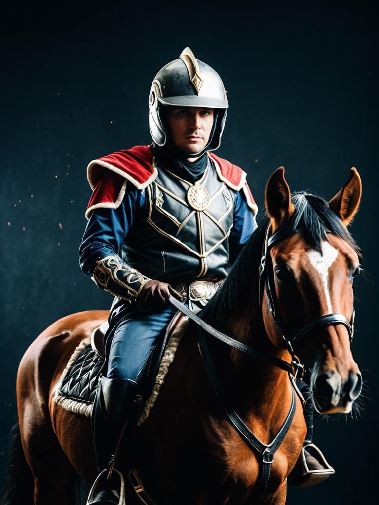 Man in Horse Rider costume, professional cosplay studio portrait, realistic tones