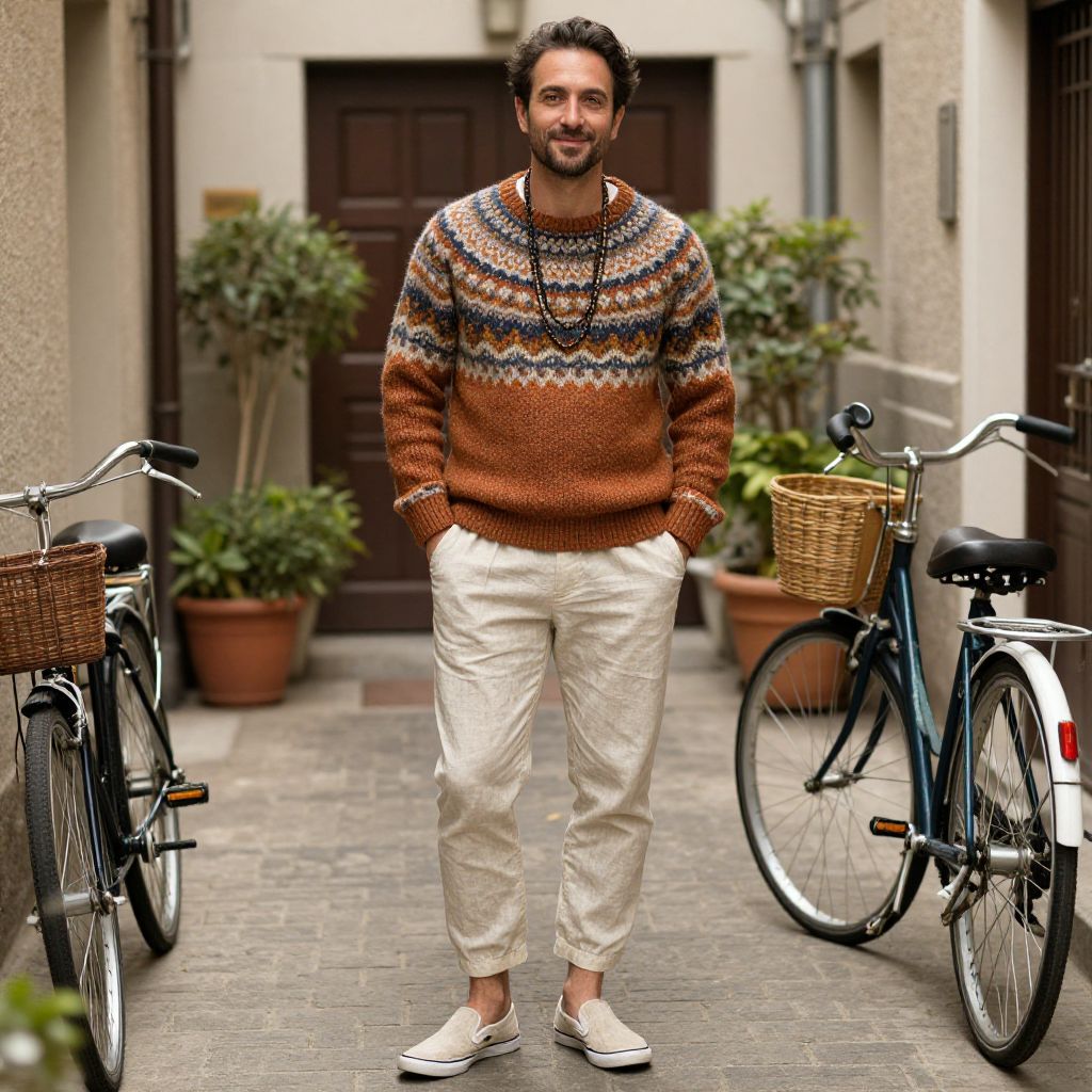 A man, oversized patterned sweater, warm autumn hues, tapered linen joggers, canvas slip-ons, layered fabric necklaces, quaint alleyway, vintage bicycles parked, potted plants lining the entrance, cinecolor, relaxed smile, inviting warmth.Man has masculine face and piercing eyes