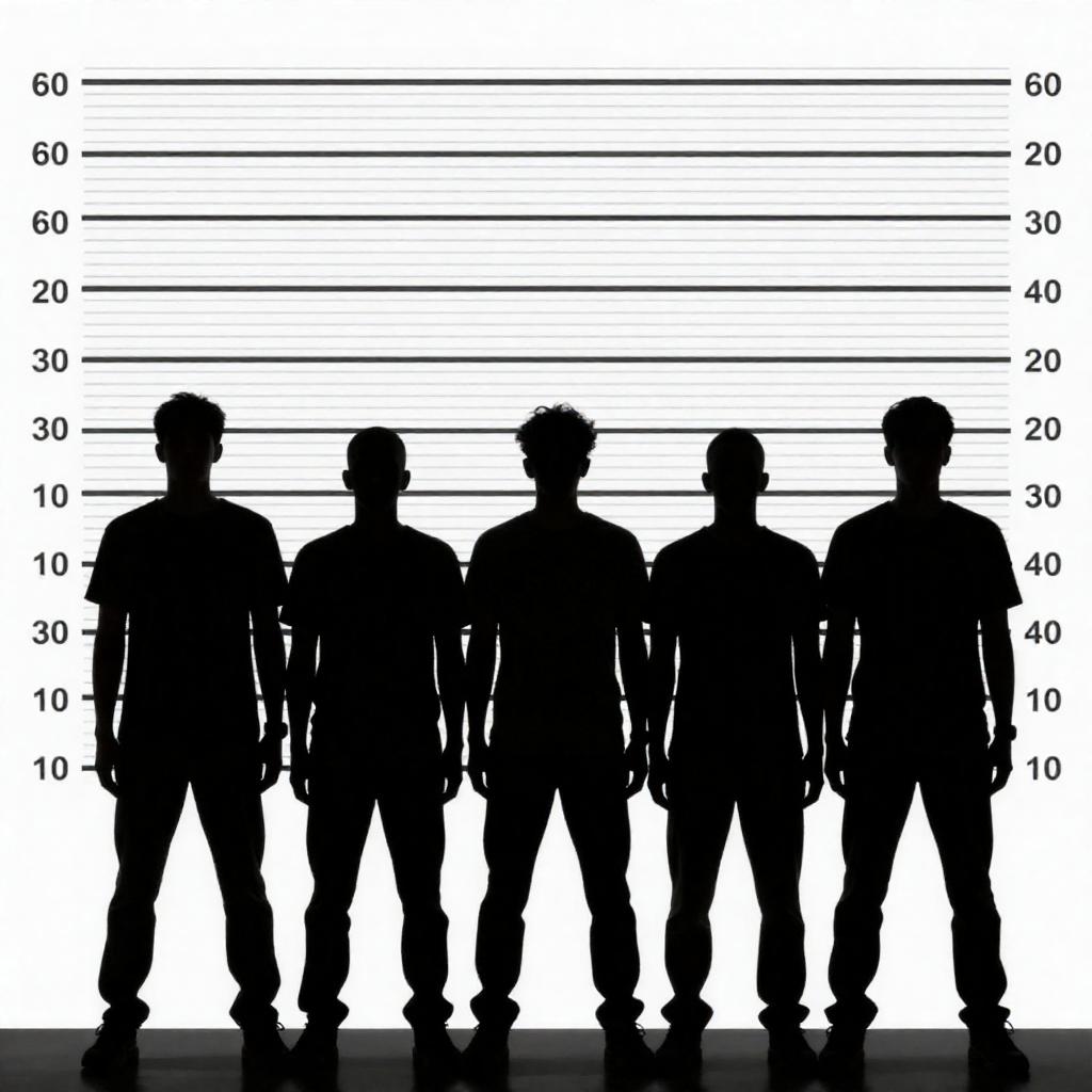 Silhouetted photograph of five men standing in a line against a height chart. All men are in dark clothing, varying in height from 10" to 60". Stands side by side, arms at different positions. No facial expressions visible.