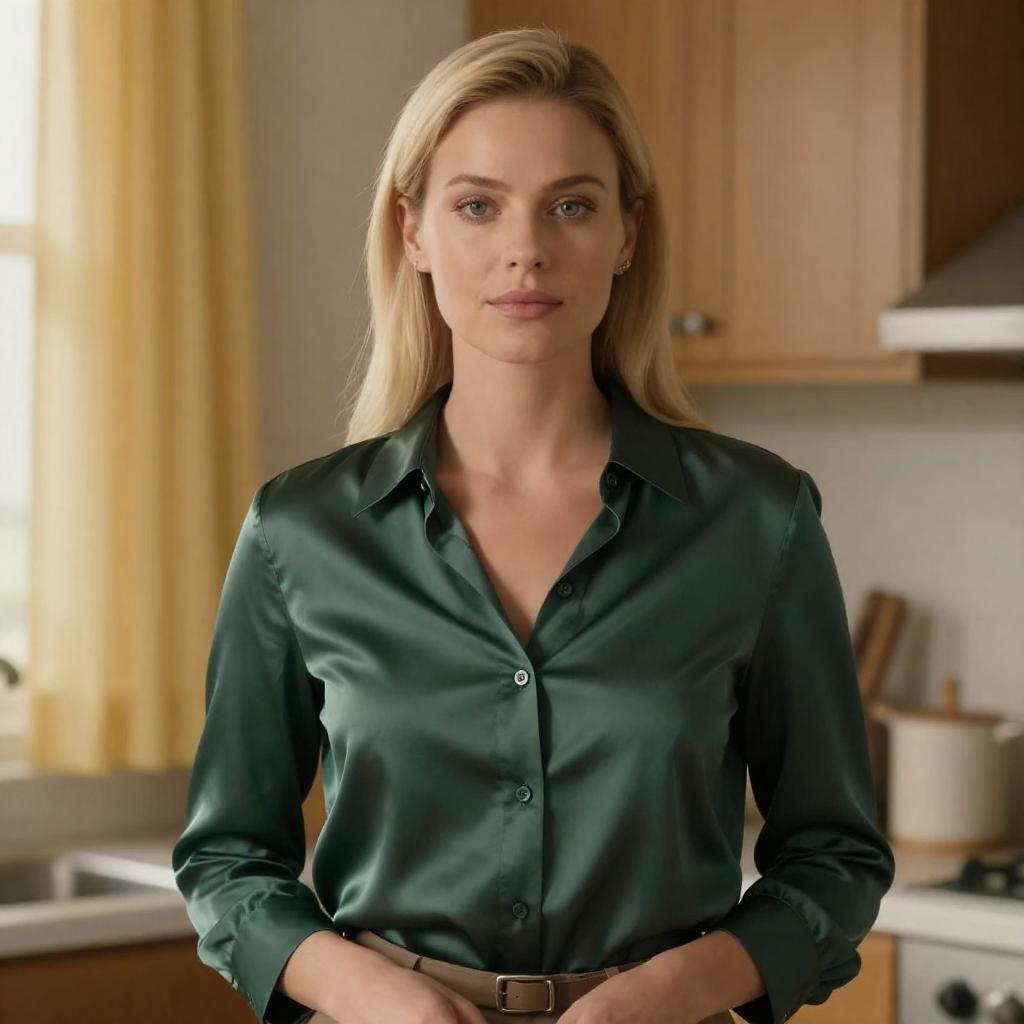 Photograph of a blonde woman with shoulder-length hair, wearing a light blue denim shirt over a pink top and black pants, standing in a doorway with her right hand touching her cheek. She has a serious expression and is looking slightly to the left. The background includes a partially open door and a carpeted floor.