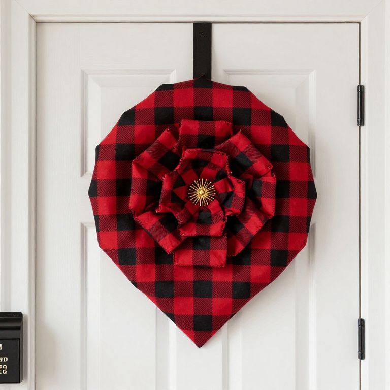 Photograph of a festive Christmas wreath hanging on a white door. The wreath is made of a red and black plaid fabric, arranged in a rosette pattern with a black ribbon hanging at the top. At the center, a small golden starburst decoration is visible. The door has a silver door handle on the right and a black electronic lock on the lower left. The contrasting colors of the plaid fabric create a vibrant and traditional holiday look.
