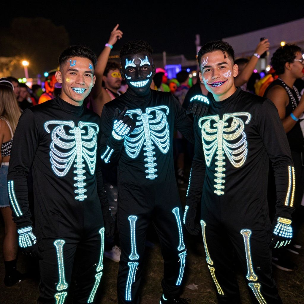 Halloween rave costumes guys wearing skeleton-themed light-up bodysuits with animated patterns, paired with neon face paint and glowing gloves, captured in a high-contrast night festival environment with energetic crowds.
