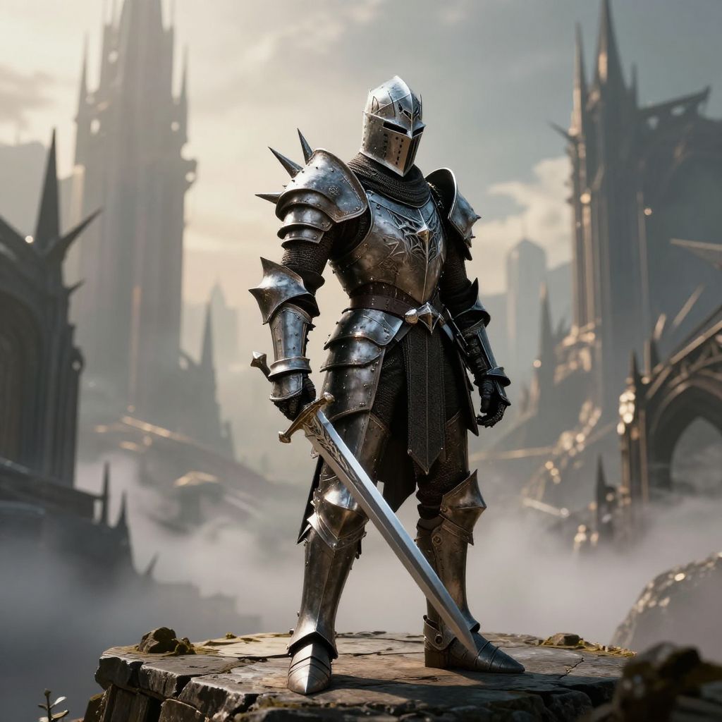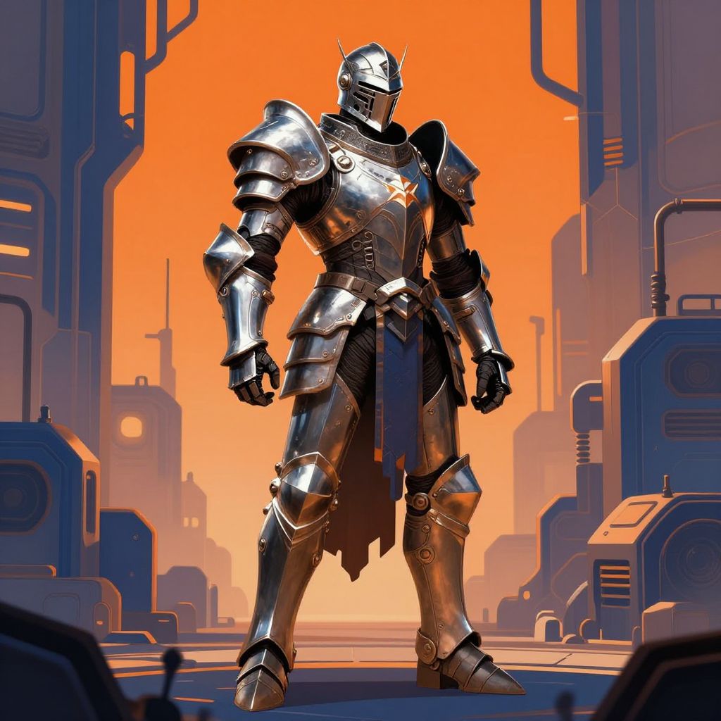Illustration of a futuristic armored knight standing confidently in a detailed industrial or sci-fi environment with orange and blue color tones. The knight is fully clad in metallic armor with intricate designs, surrounded by complex machinery and structures.