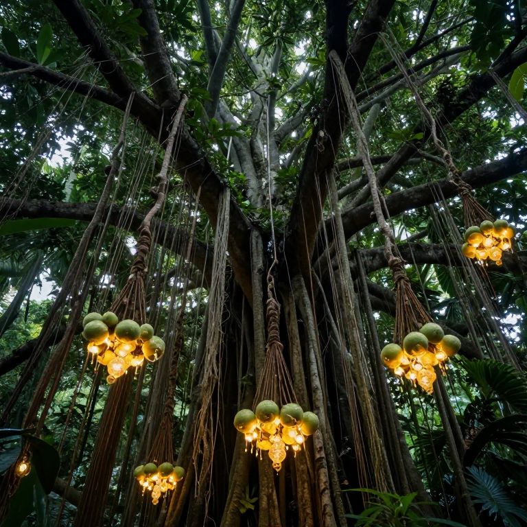 Photograph of a towering, ancient tree with thick, dark brown branches, adorned with glowing, yellow spherical lanterns hanging from long, thin vines in