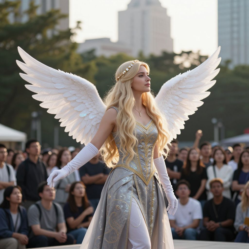 Woman in Angel Costume with White Wings in City Square