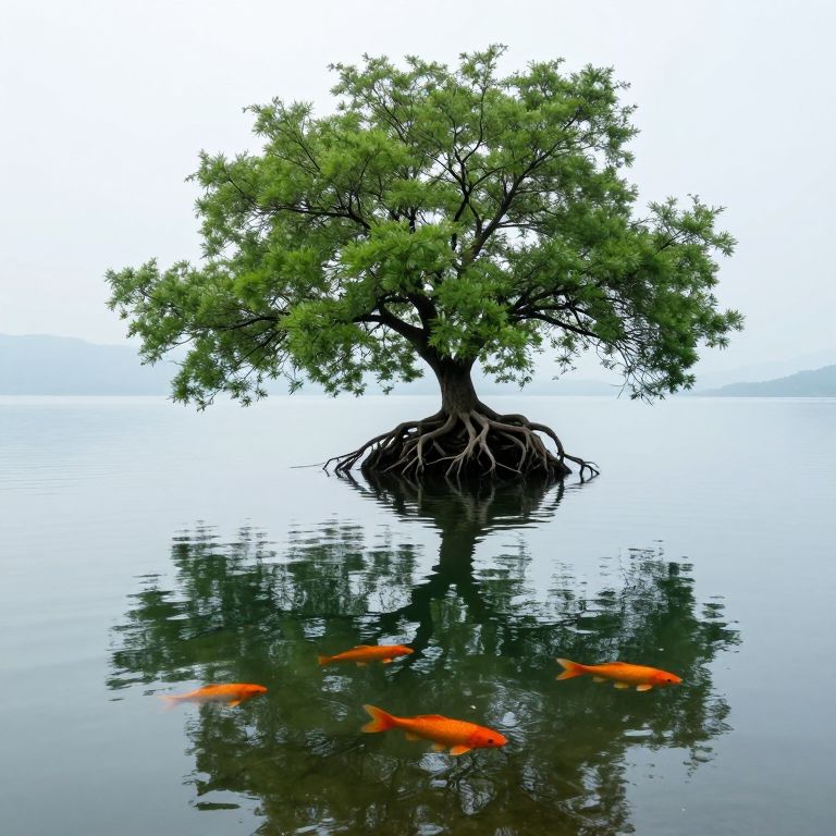 Roots extend gracefully from a lush, green tree perched atop a small island in a serene, glassy lake, while three vibrant orange fish swim silently beneath the water's surface, mirroring the tranquil scene above.