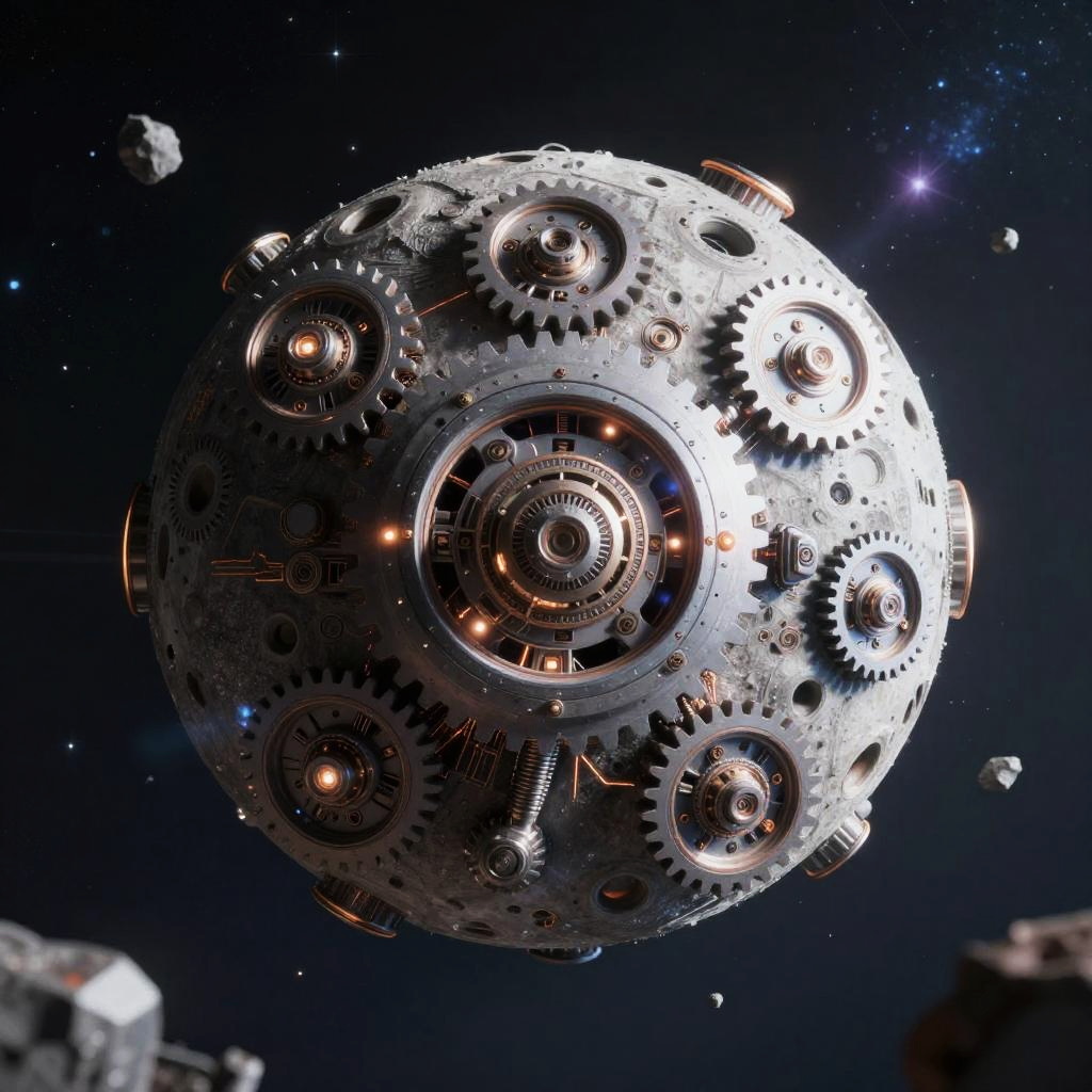 Gear 5 moon orbiting a distant planet in a cyberpunk universe, mechanical moon parts emitting soft light, surrounded by floating debris and star clusters, dynamic composition with vivid contrast and intricate mechanical details.