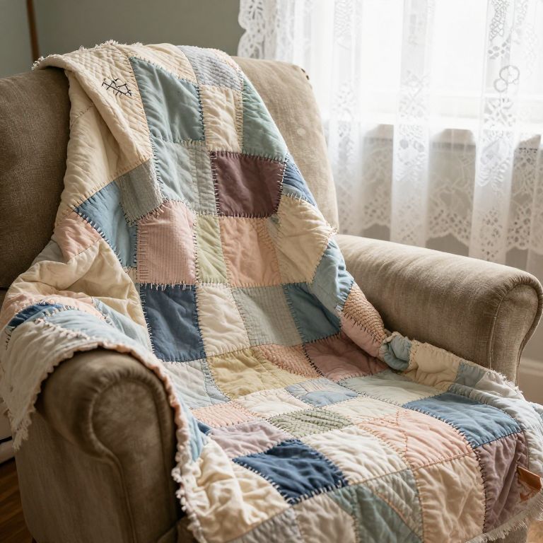 Reclaimed fabric patchwork quilt draped over a worn armchair, muted pastel palette, cozy cottage interior, detailed stitches and frayed edges, soft daylight filtering through lace curtains, nostalgic mood, ultra detailed close-up.