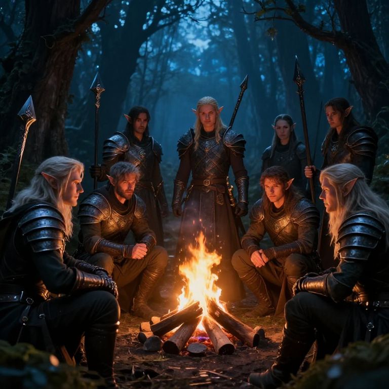 Elf fantasy art, a group of elven warriors gathering around a magical campfire in a twilight forest, detailed armor and weapons, ethereal light effects, expressions of determination, high fantasy setting with intricate natural elements, cinematic composition