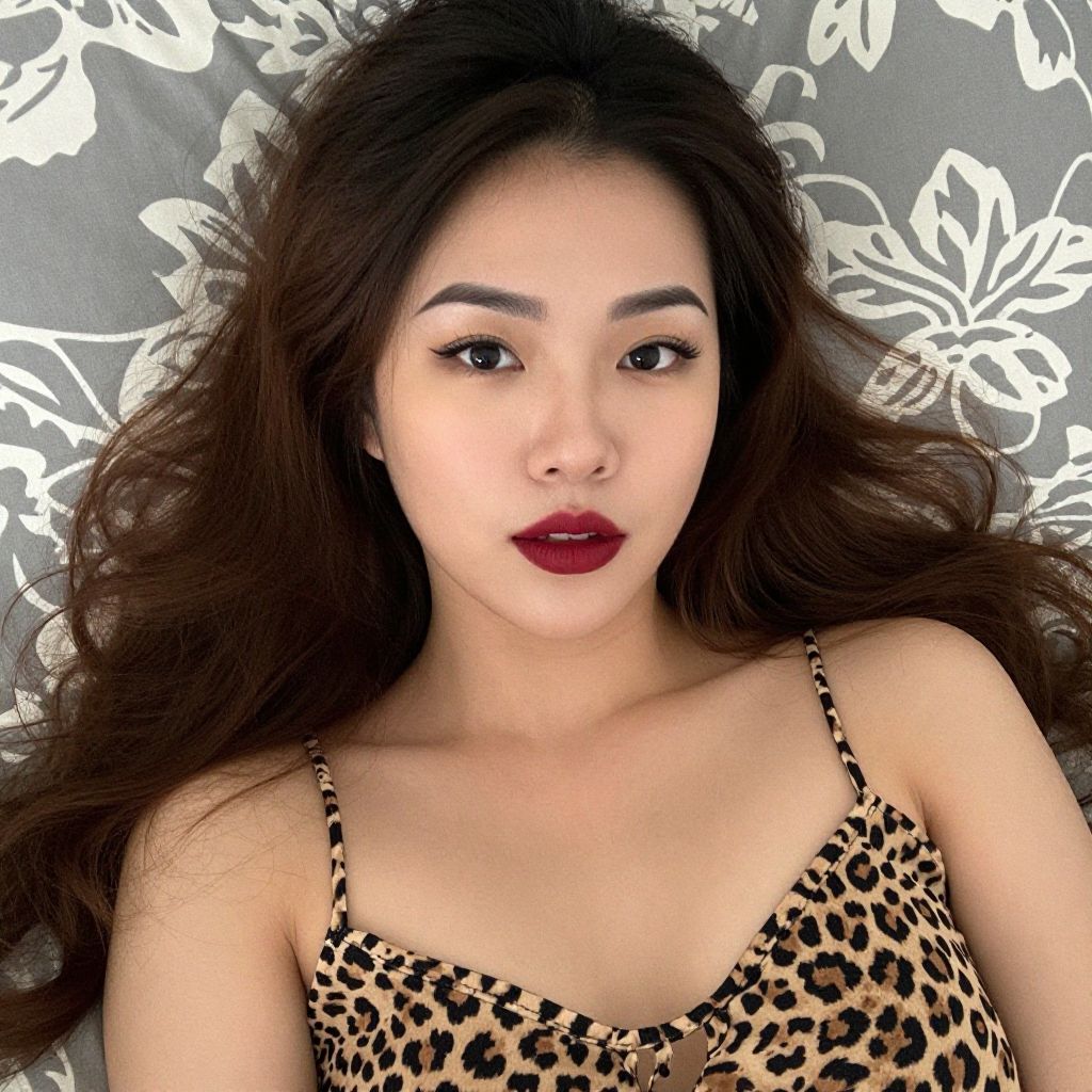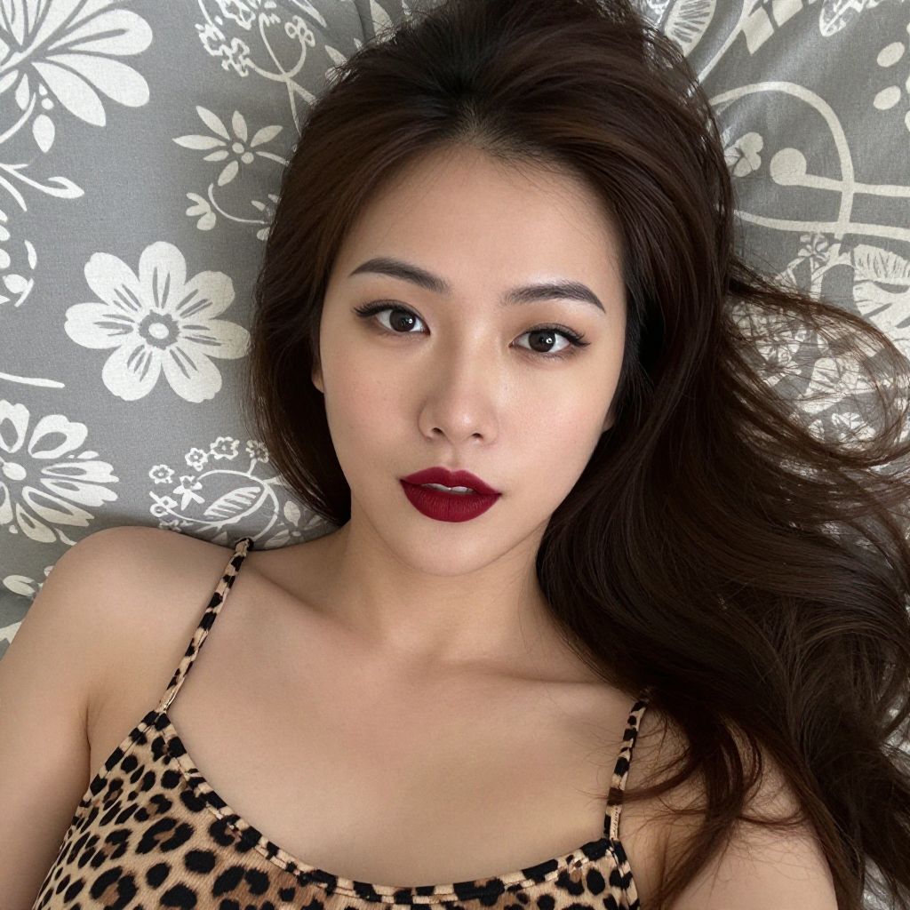 Photograph of an Asian woman with long, wavy brown hair, lying on a bed with gray pillows featuring white floral patterns. She has dark, arched eyebrows, bold black eyeliner, and deep red lipstick. She's wearing a leopard print spaghetti strap top, showcasing her fair skin. The image has a soft focus, highlighting her relaxed expression and the patterned background.
