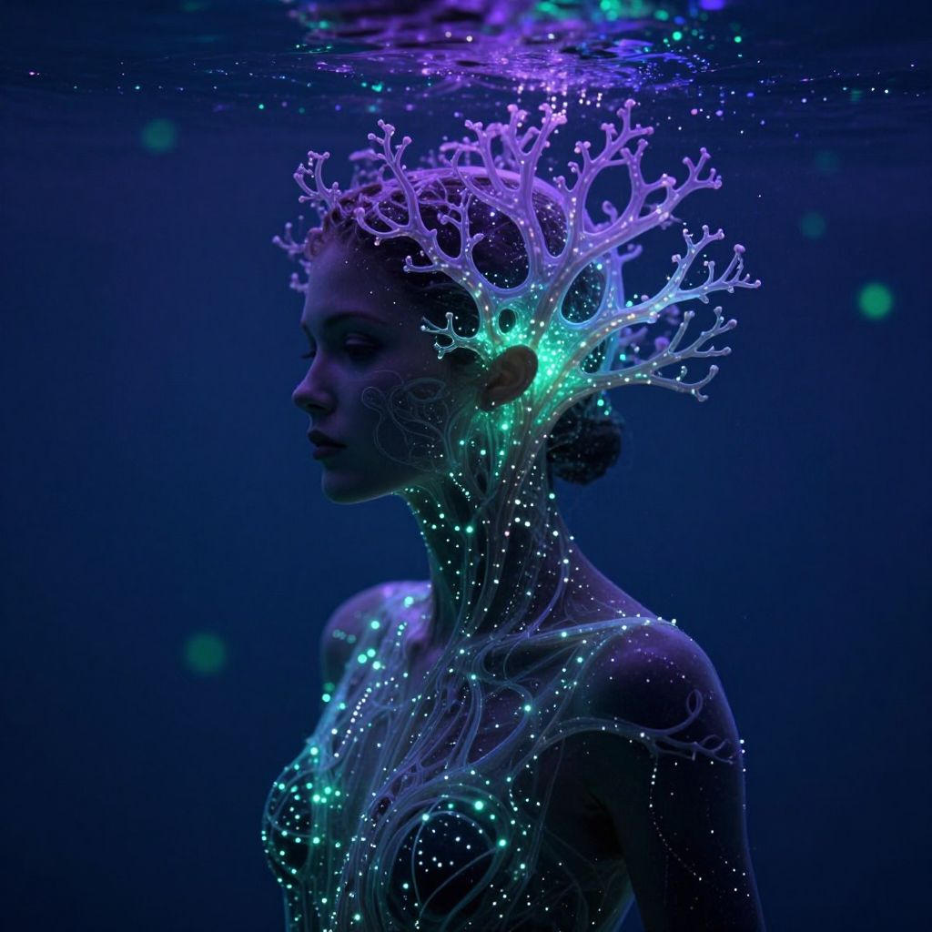 The image presents a surreal, bioluminescent scene featuring a woman's silhouette submerged in water. Her head and upper body are adorned with intricate, tree-like structures that emit a soft, ethereal glow, predominantly in shades of purple and green. The background is a deep, dark blue, with subtle hints of green and purple lights creating a dreamlike atmosphere. The woman's face is partially obscured by the glowing, organic forms, adding a sense of mystery and depth to the composition. The overall scene is highly detailed, with a realistic render that captures the interplay of light and shadow, creating a visually striking and otherworldly effect. The image is rendered in 8k resolution, providing a high level of clarity and detail, and is presented in a creative, artistic style.