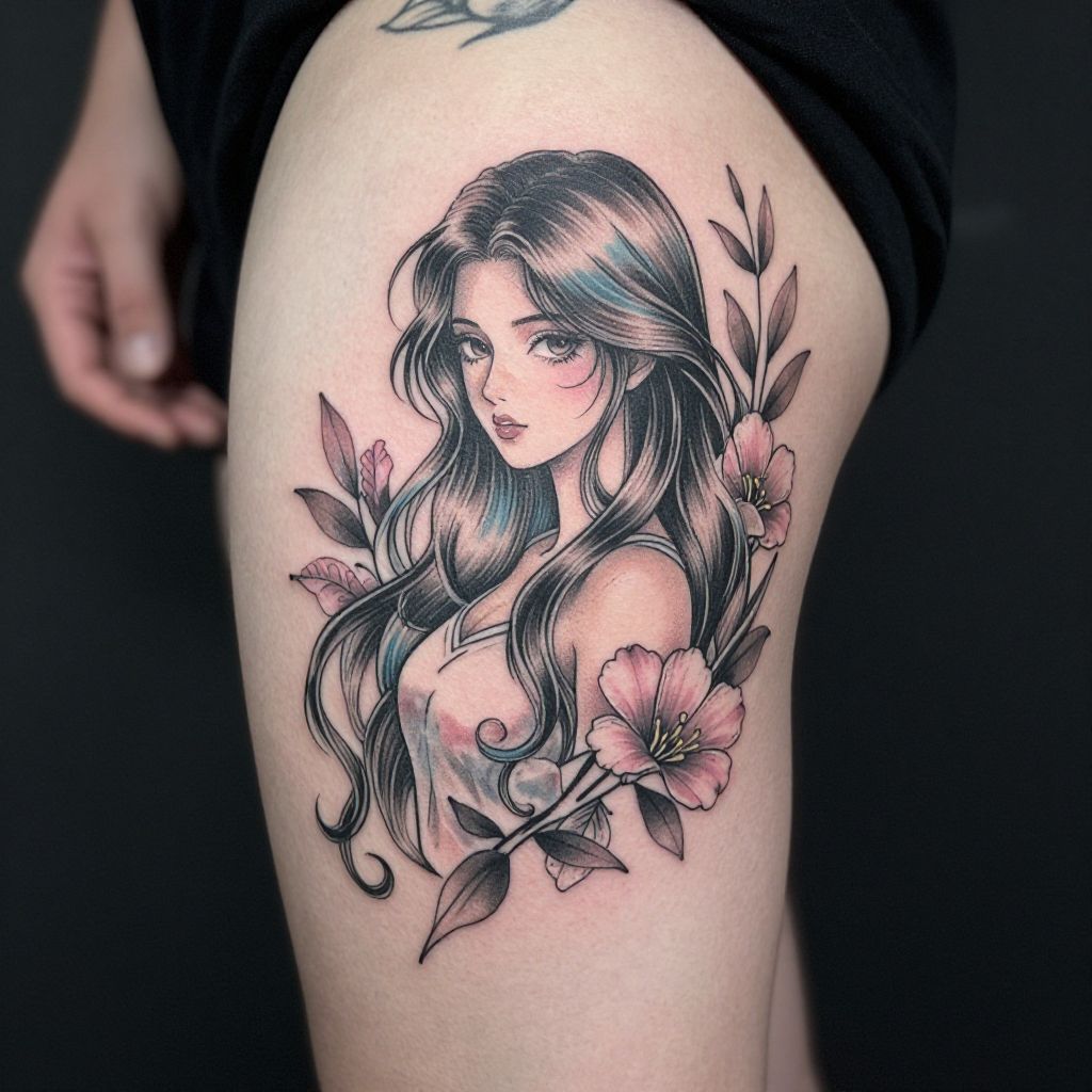 Photograph of a person's thigh featuring a detailed, colorful tattoo of a beautiful, anime-style woman with long, flowing hair, surrounded by flowers and leaves. The tattoo uses shades of pink, blue, and black, with soft shading and delicate lines. The person's hand is partially visible on the left, and another tattoo is visible on the upper thigh. Background is blurred and dark.