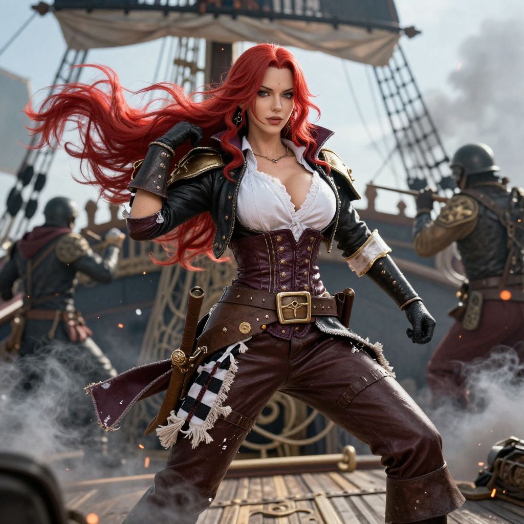 Female Shanks cosplay, vivid red hair blowing in the wind, elaborate pirate outfit with detailed textures, dramatic ocean background, intense gaze, dynamic pose, cinematic lighting, high detail, fantasy art style