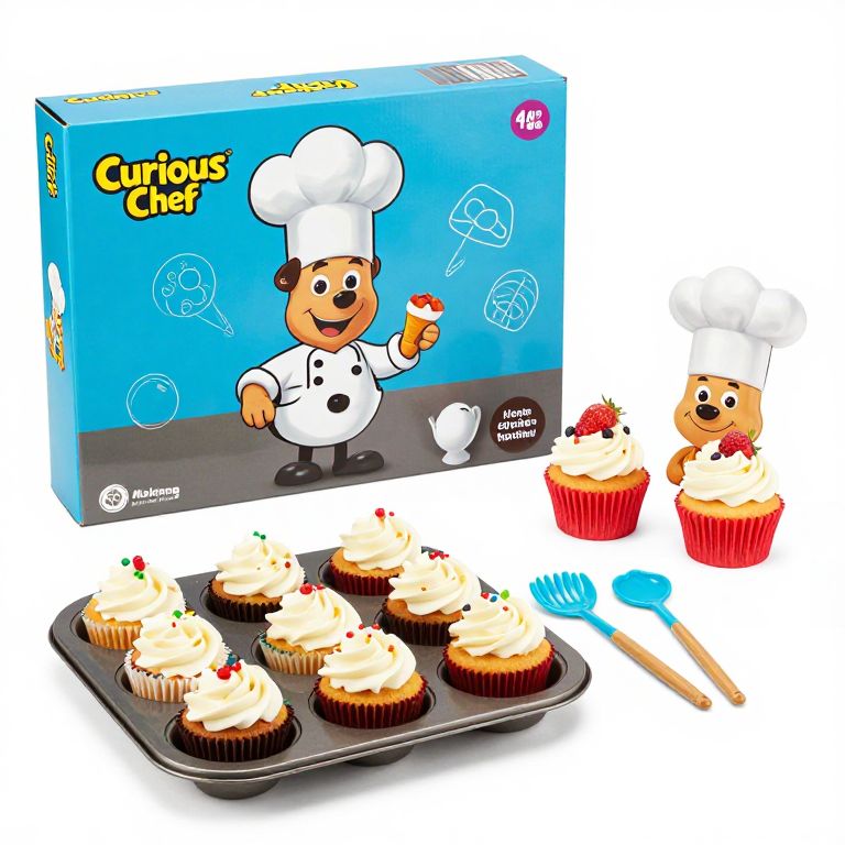 Photograph of a "Cuisine Chef" kids' cupcake kit. The blue box features a cartoon chef with a large smile, white hat, and black hair, holding an orange carrot. The box has white cupcake illustrations and "Age 3+" on the top right. In front, there's a tray of six cupcakes with white frosting, cherries, and a pair of blue and yellow plastic utensils. Three additional cupcakes with strawberries are beside the box. The overall style is bright and colorful, appealing to children.