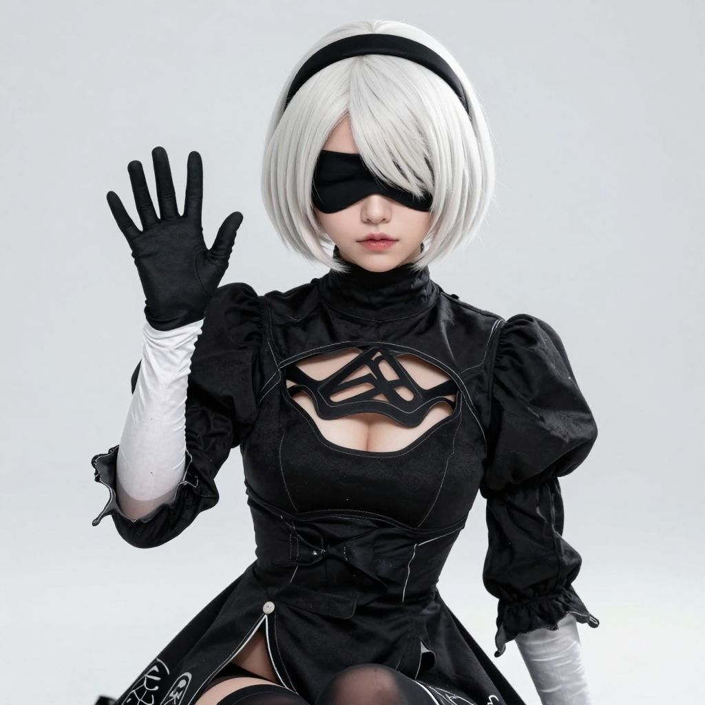 Yorha no. 2 type b, 1girl, bangs, black blindfold, black dress, black gloves, black hairband, blindfold, blindfold removed, breasts, cleavage cutout, clothing cutout, commentary request, dress, gloves, hairband, half-closed eyes, hand up, highres, io (sinking=carousel), juliet sleeves, long sleeves, looking at viewer, medium breasts, mole, mole under mouth, nier (series), nier automata, no blindfold, parted lips, puffy sleeves, short hair, solo, thighhighs, turtleneck, upper body, white hair