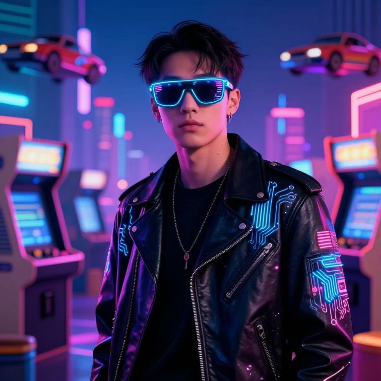 Trillwave portrait of a cyberpunk character wearing neon-lit sunglasses and a leather jacket adorned with glowing circuit patterns, standing against a backdrop of a city filled with vintage arcade machines and flying cars, saturated with colorful vaporwave aesthetics.