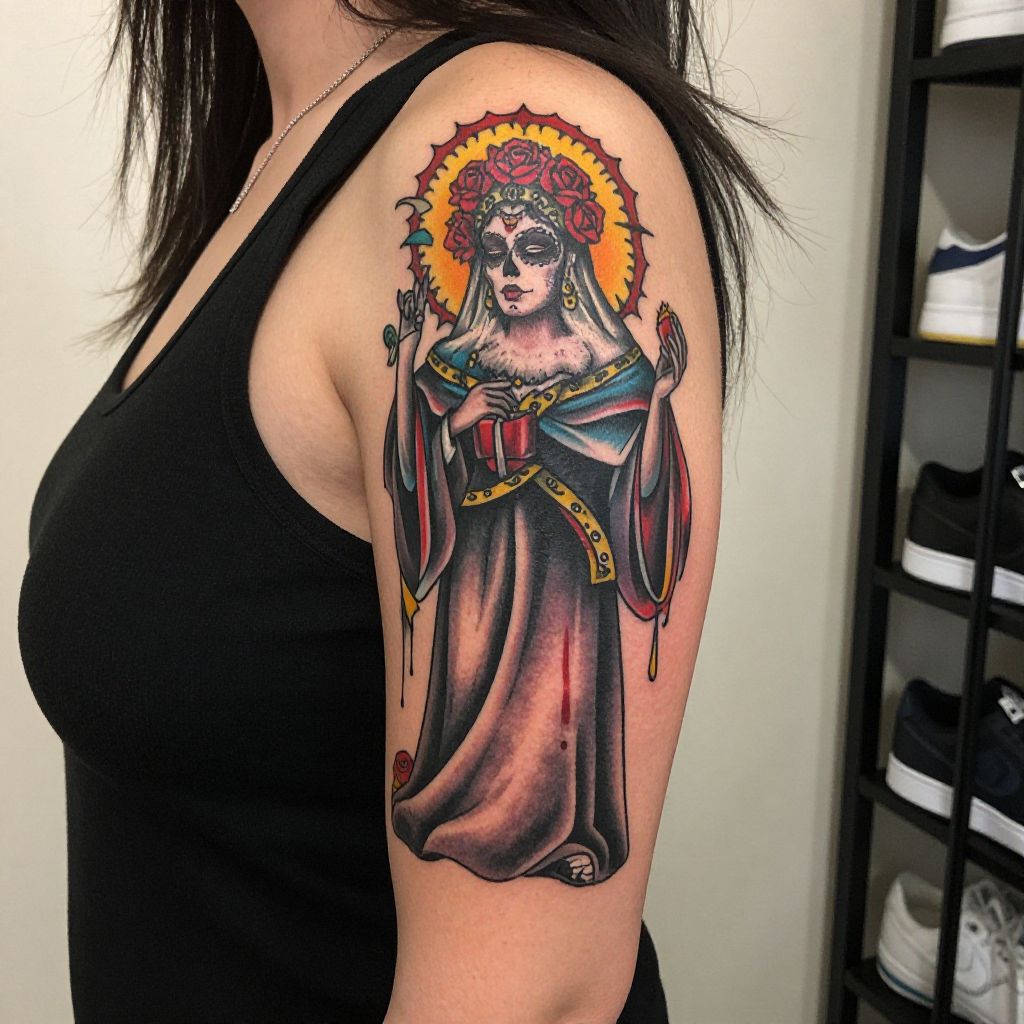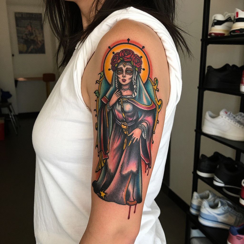 Woman showcasing a vibrant tattoo of Santa Muerte on her upper arm, featuring intricate details including a halo, red rose crown, flowing robes, and dripping blood, set against a casual indoor backdrop with a shoe rack visible to the right.