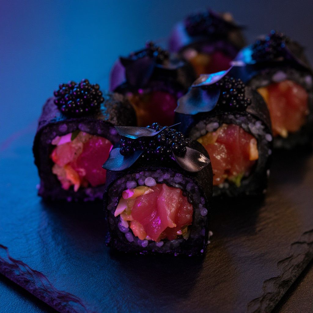 Close-up of dark sushi mix rolls, filled with spicy tuna and topped with black caviar and thin sliced black garlic, arranged elegantly on a dark slate plate with subtle neon reflections, evoking a modern, edgy culinary vibe