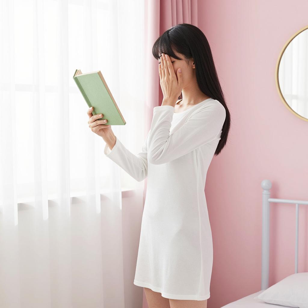 Woman with long brown hair, back view, sits at table, holding object. Table has white lamp, framed photo, floral tablecloth. Background: beige walls, circular mirror, blue vase, window with blinds. Soft light, cozy setting.