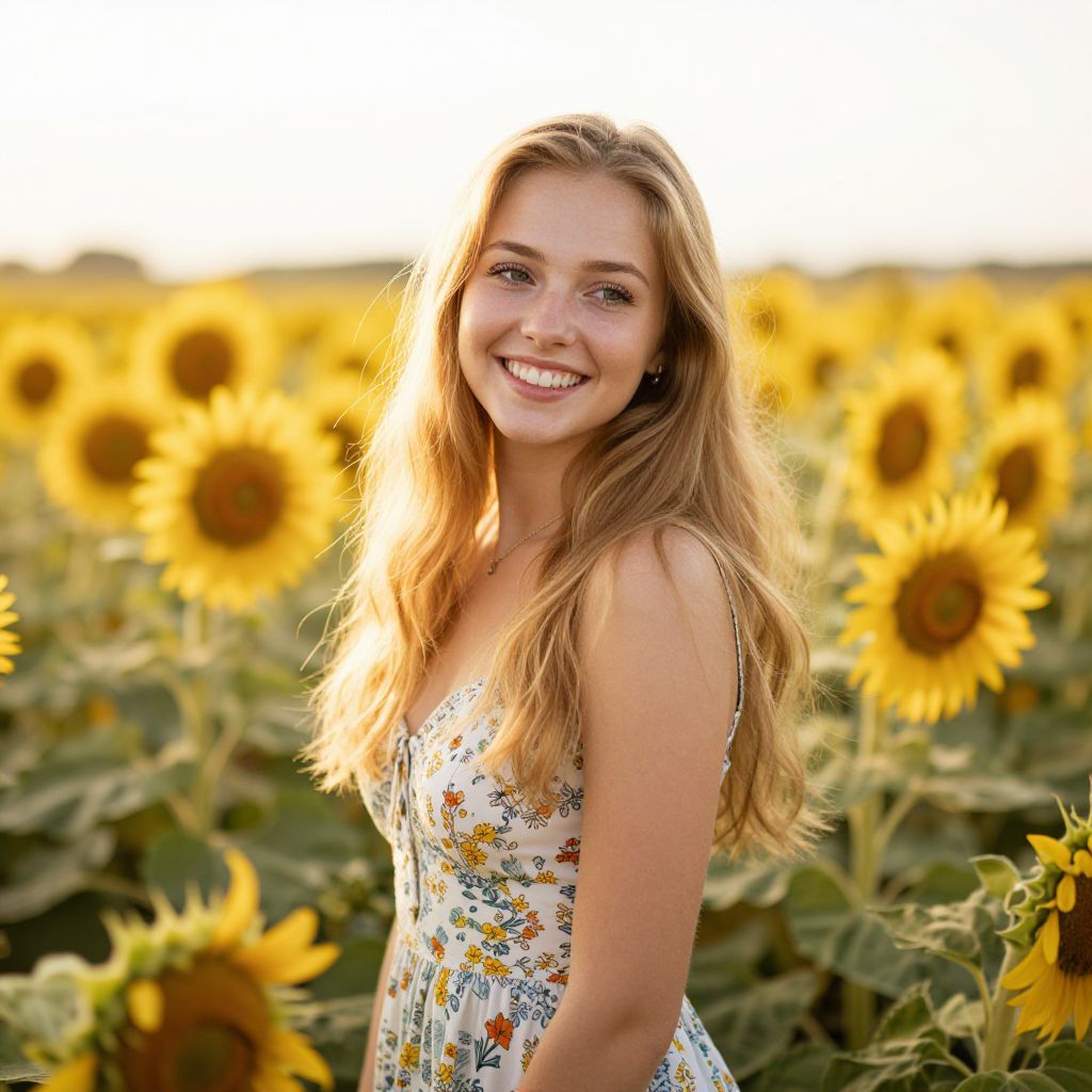 Photograph of a smiling young woman with long blonde hair, wearing a floral dress, standing in a sunlit sunflower field.