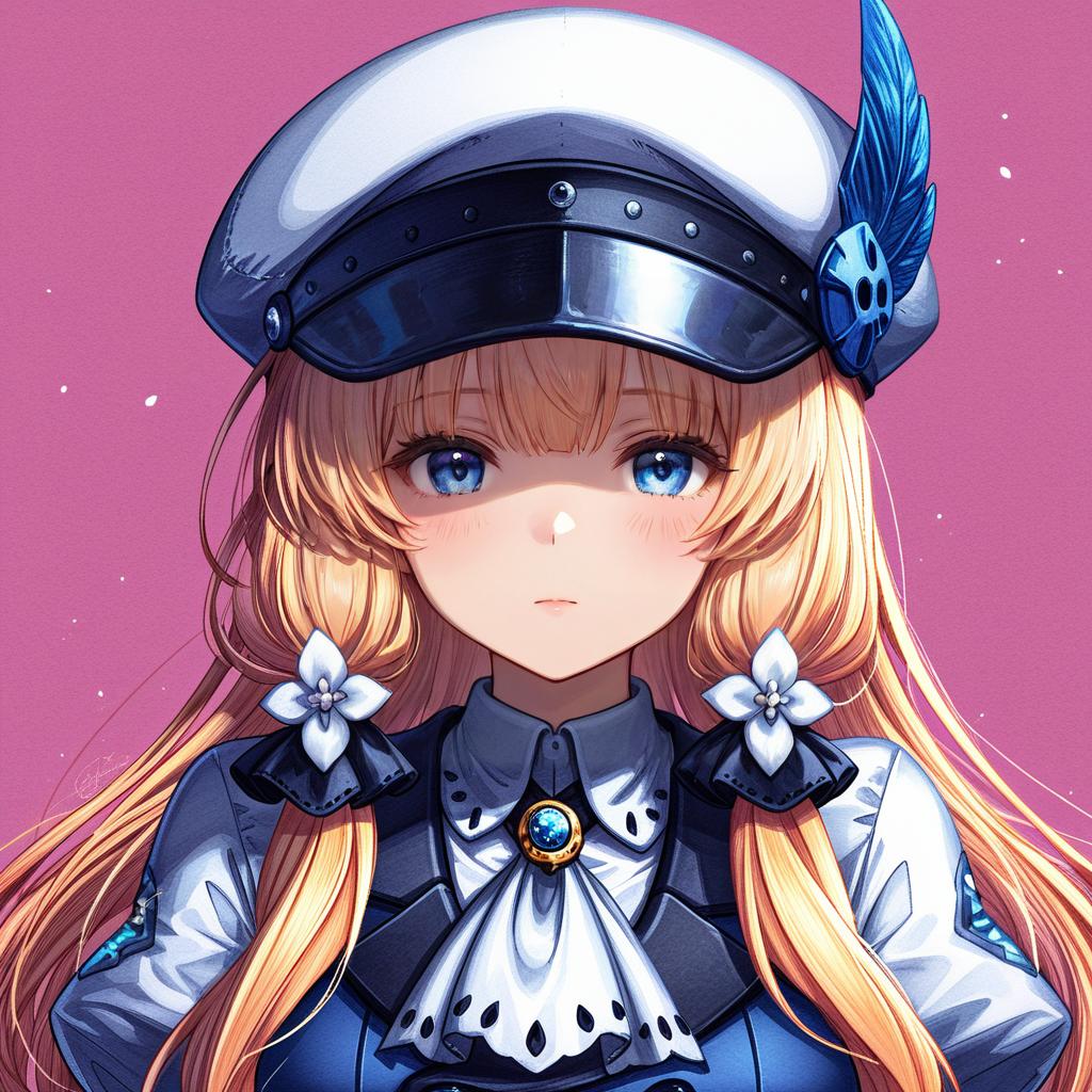 Gunner (sekaiju), sekaiju no meikyuu, 1girl, blue eyes, blonde hair, long hair, hat, by artist murata yuusuke, dark_illustrious