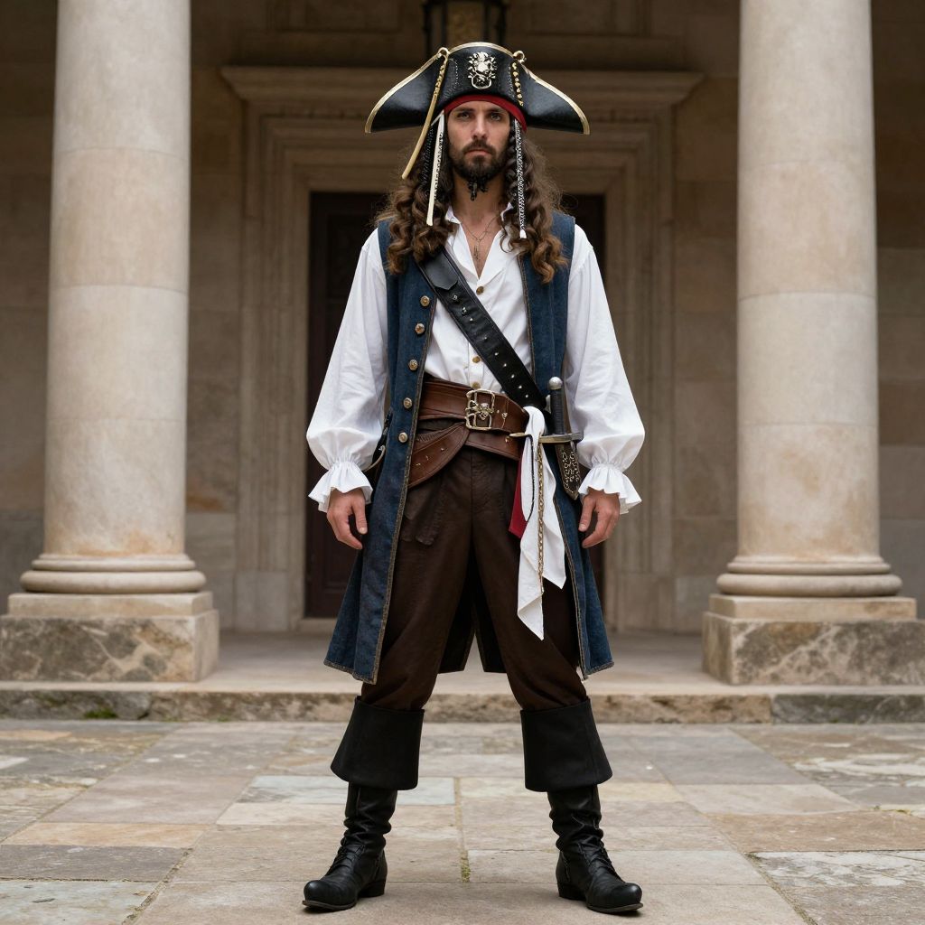 Pirates Penzance Costume, pirate in costume standing in front of a building with a sword