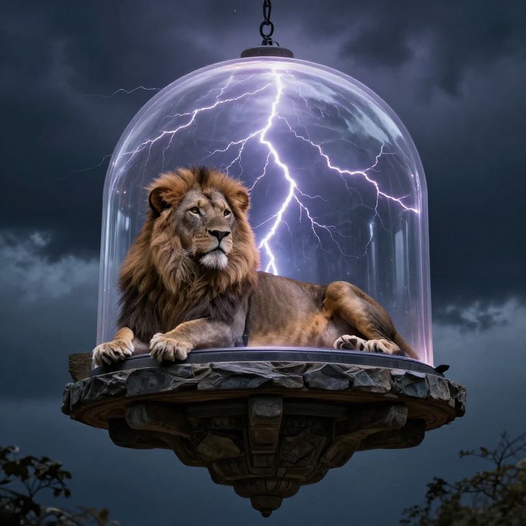 A gaseous lion, suspended in a glass void, breathes shimmering geometric smoke that forms constellations before dissolving into laughter.