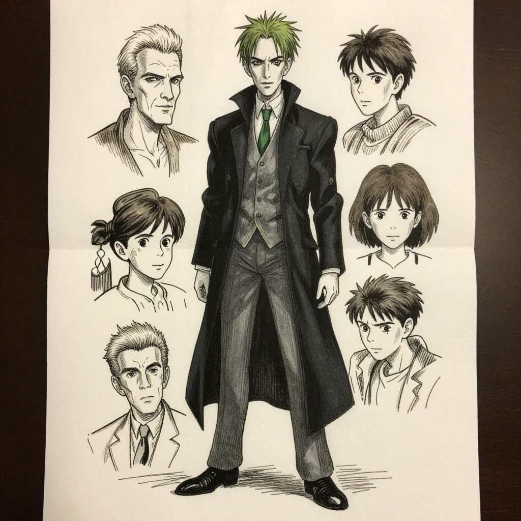 Anime-style digital drawing of a green-haired man in a long black coat and suit, surrounded by six headshots of different characters. Monochrome with black
