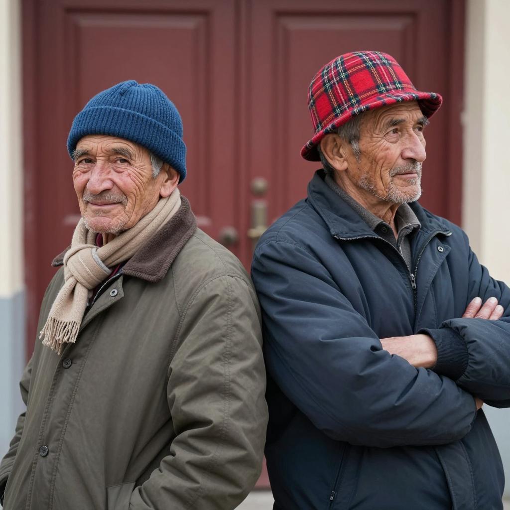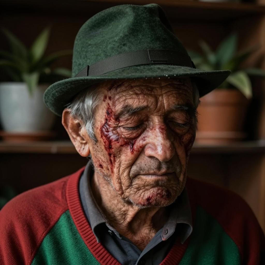 Close-up of an old man with deeply wrinkled, bloodied face wearing a green hat and red-green sweater. Background has dark shelves with potted plants. Man's eyes are closed, head tilted down. Shadows and dim lighting create a grim atmosphere.