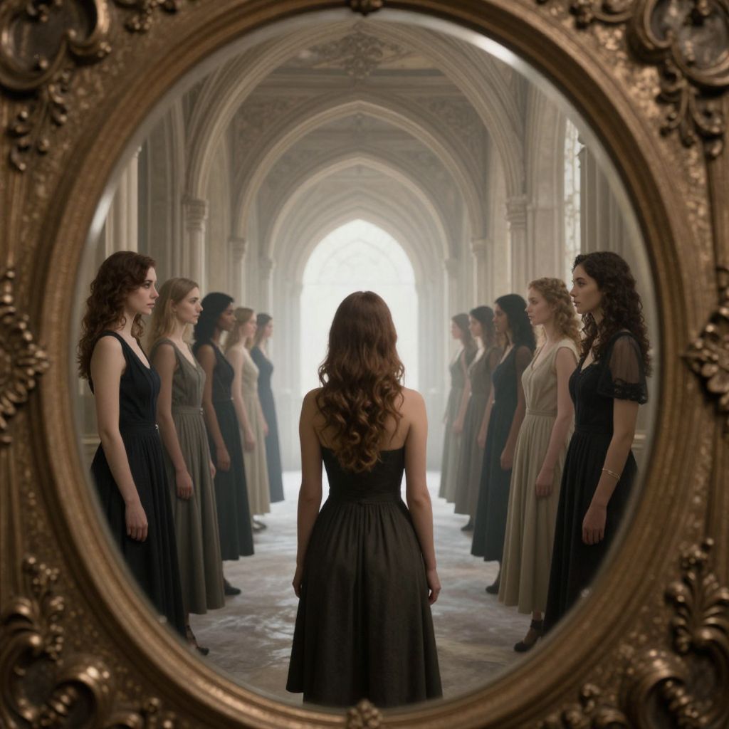 Photograph of a young woman with long, wavy brown hair, wearing a black, sleeveless, floor-length dress, standing in the center of a grand, Gothic-style hall with arched ceilings and stone columns. She faces a symmetrical line of women, each with different hairstyles and dresses in shades of black, beige, and gray, standing in two rows flanking her. The scene is reflected in an ornate, oval, golden-framed mirror, creating a sense of depth and perspective. Soft, natural light filters through an arched window at the far end of the hall, illuminating the scene.