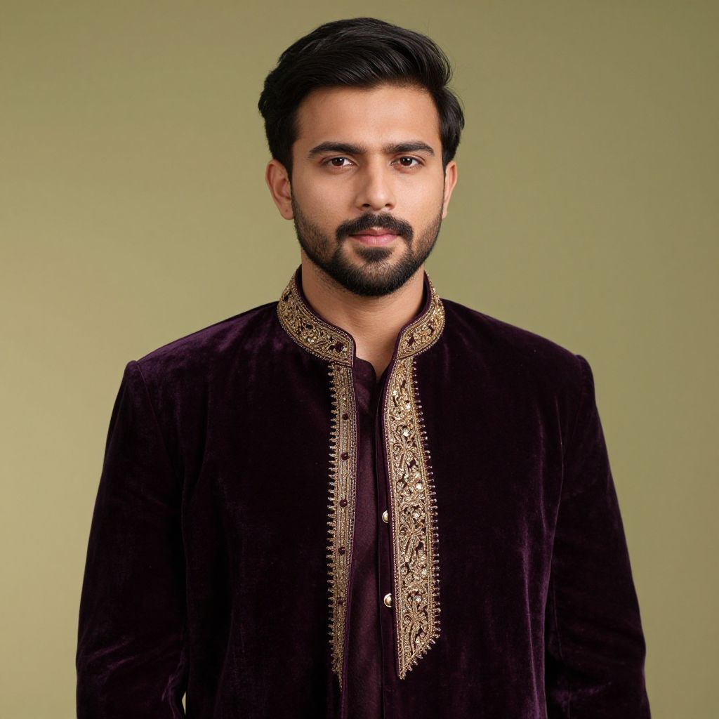 Velvet sherwani, 1boy, male focus, solo, facial hair, realistic, black hair, mustache, looking at viewer, upper body, beard, jacket