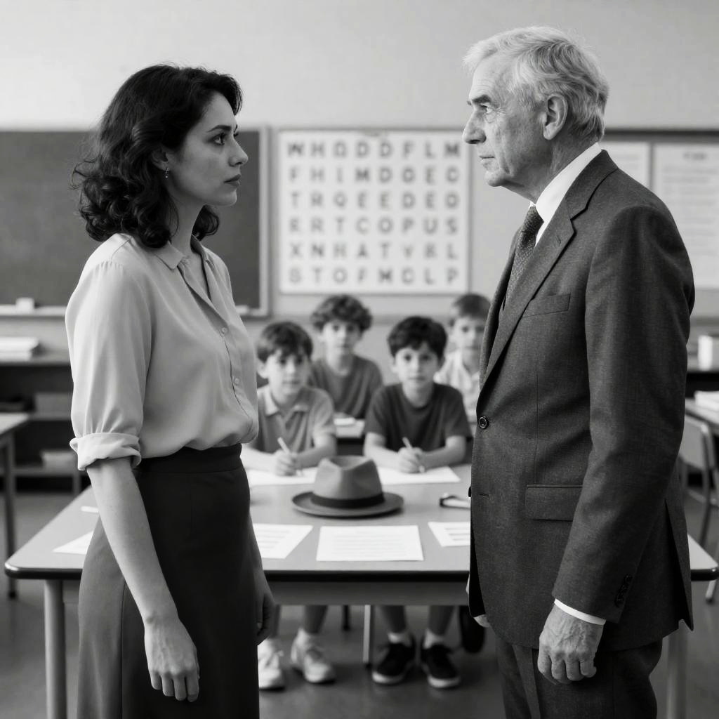 Black-and-white photograph of three people. Man in military uniform, short dark hair, focused expression, hands outstretched. Woman in light blouse, short dark hair, side profile, intense gaze. Older man in dark suit, white shirt, white hair, gesturing. Background: dimly lit brick archway. All three interact closely.