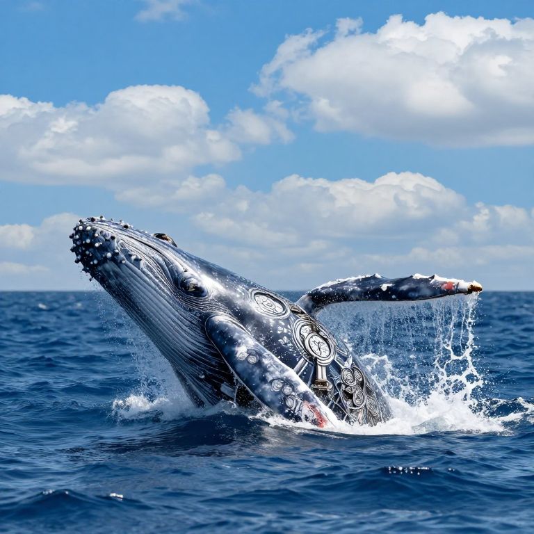 Whale breaches gracefully above the deep blue ocean, its body adorned with intricate clockwork patterns as it slices through the waves beneath a vibrant sky dotted with fluffy white clouds.