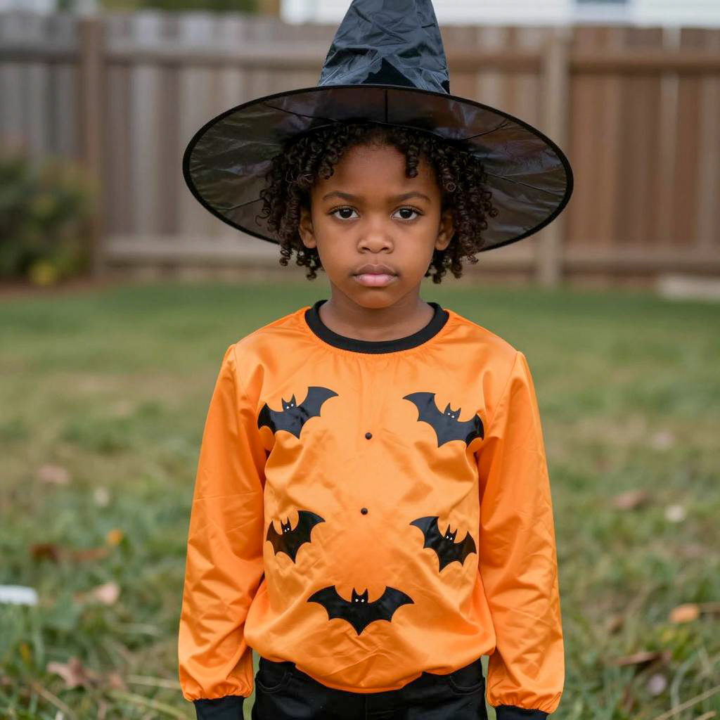 African american halloween, photograph of African-American child, Halloween costume, bright orange shirt with black bat prints, black buttons, puffy sleeves, black trim, black pants, witch hat with dark gray and black colors, curly black hair, serious expression, outdoor background, green grass, blurred brown fence, sunny day, natural light, realistic style