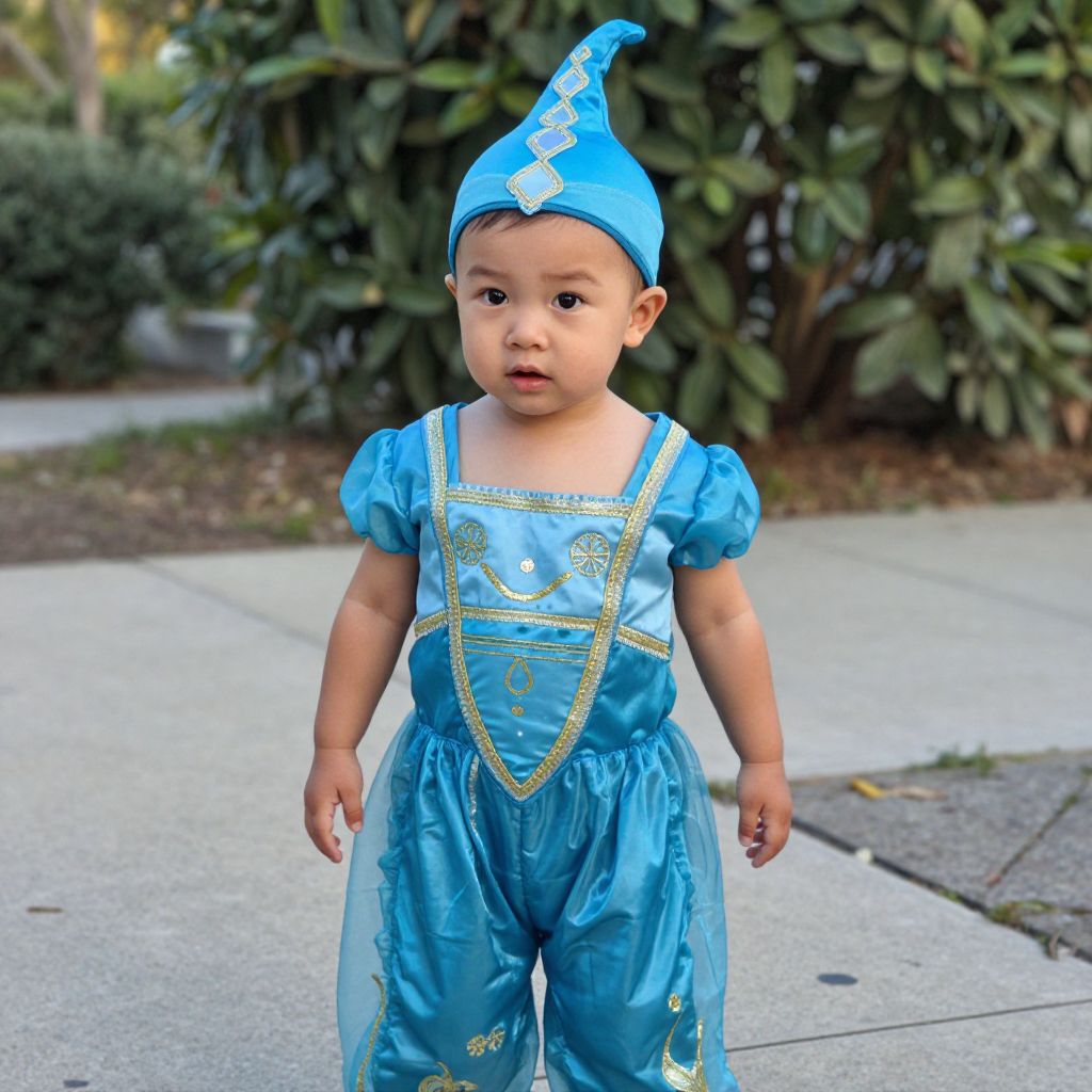 Photograph of a young Asian toddler wearing a blue genie outfit with gold accents, a pointed hat, and standing on a concrete sidewalk with green foliage in