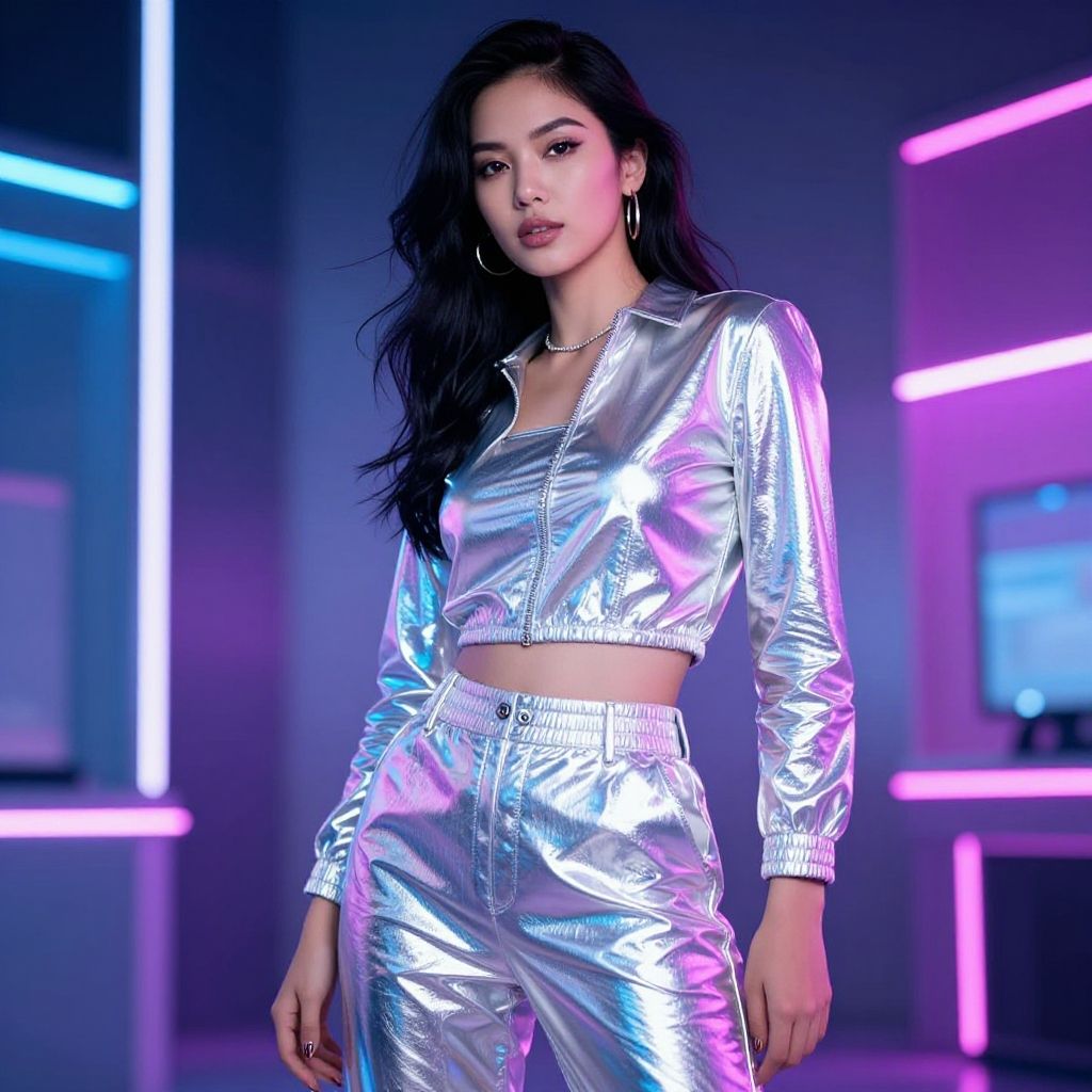 Young Asian woman wearing a silver metallic futuristic jumpsuit and matching sunglasses on her head, standing outdoors with neon lights and green plants in the background at night.
