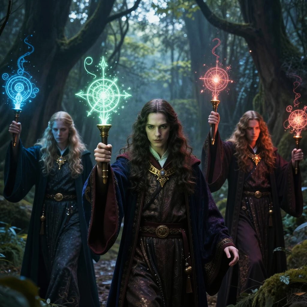 Receding hairline characters depicted as fantasy wizards casting spells, mystical glowing runes, dark enchanted forest background, richly detailed robes and magical effects