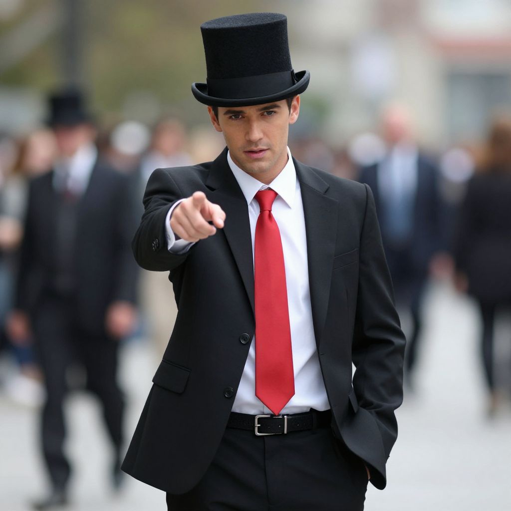 Photograph of a handsome man in a black suit, white shirt, red tie, and black top hat, pointing forward with a confident expression, surrounded