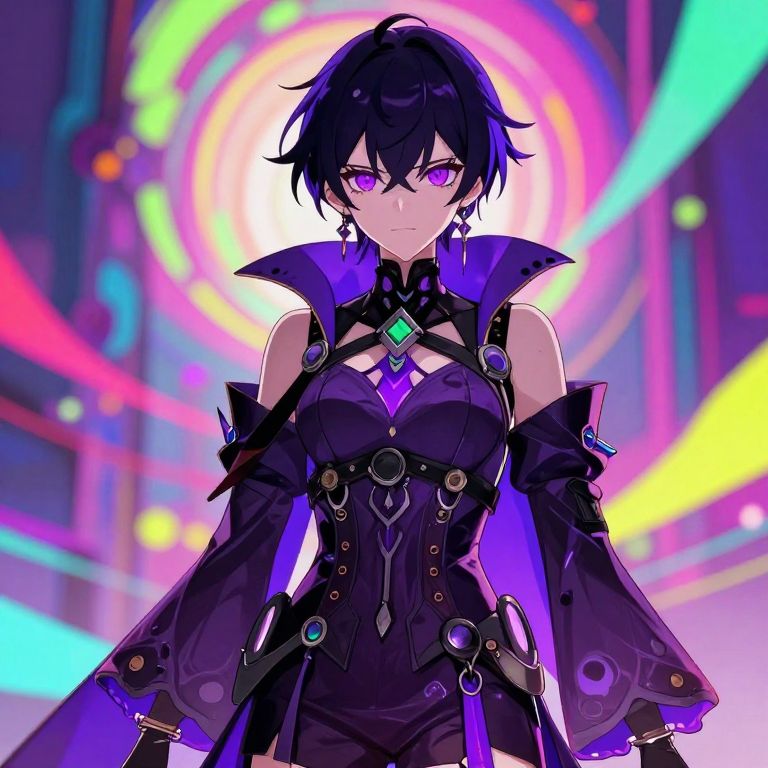 A gothic anime RPG character with purple eyes, dark hair, and a detailed, futuristic outfit stands against a vibrant, psychedelic background with day-glo colors.