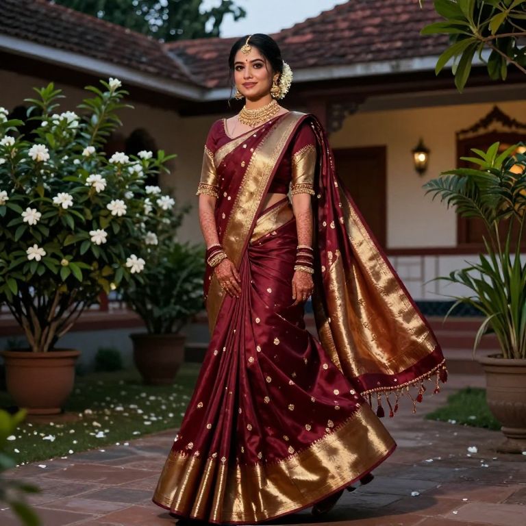 A realistic portrait of a bridal wear ensemble at a traditional wedding in a heritage bungalow, a young bride in her 30s with fair skin, wide almond-shaped eyes, and a gentle smile wearing a heavy silk saree made of rich maroon and gold thread, the saree flaring out as she turns to face the camera in front of a lush jasmine garden at dusk