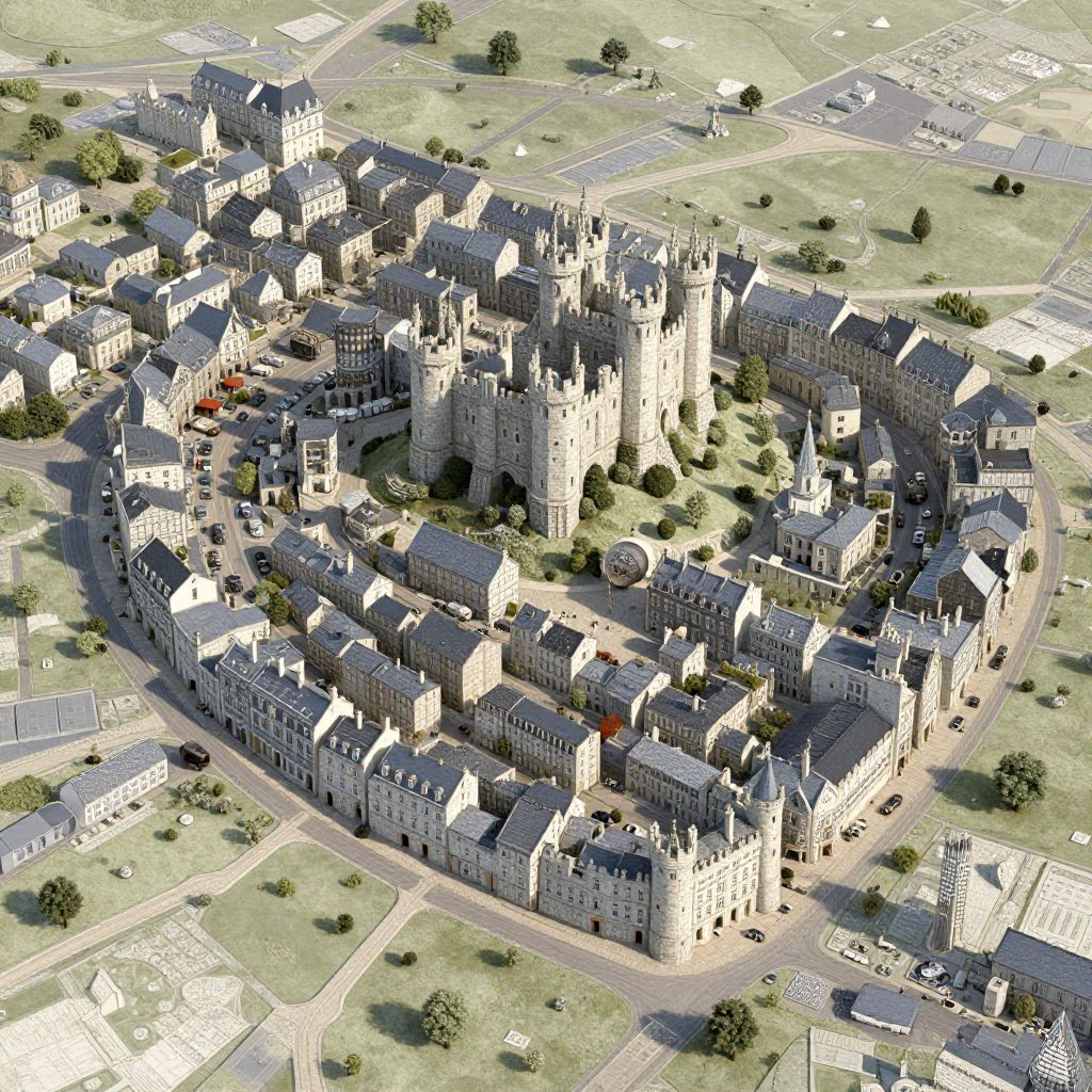 Aerial view of a medieval-style, walled town with gray stone buildings, central castle, and surrounding green fields and roads. Photorealistic CGI