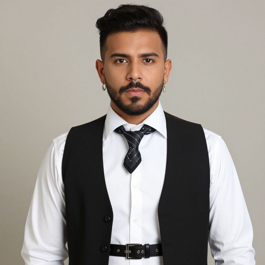 Photograph of a young, light-skinned South Asian man with a neatly trimmed beard and short, dark hair. He has small earrings in both ears. He is dressed in a white dress shirt, black tie with white diagonal stripes, and a black vest with a black belt. His expression is neutral, and he looks directly at the camera. The background is a plain, light gray. The overall style is modern and formal, with a sharp contrast between the black vest and white shirt.